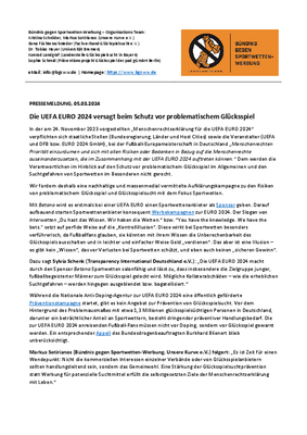 In der am 24. November 2023 vorgestellten „Menschenrechtserklärung für die UEFA EURO 2024“ verpflichten sich staatliche Stellen (Bundesregierung, Länder und Host Cities) sowie die Veranstalter (UEFA und DFB bzw. EURO 2024 GmbH), bei der Fußball-Europameisterschaft in Deutschland „Menschenrechten Priorität einzuräumen und sich mit allen Risiken oder Bedenken in Bezug auf die Menschenrechte auseinanderzusetzen, die im Zusammenhang mit der UEFA EURO 2024 auftreten können.“ Dem werden die Verantwortlichen im Hinblick auf den Schutz vor problematischem Glücksspiel im Allgemeinen und den Suchtgefahren von Sportwetten im Besonderen nicht gerecht.